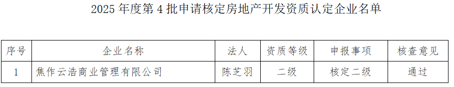 根據《房地產開發(fā)企業(yè)資質管理規(guī)定》《河南省城市房地產開發(fā)經營管理條例》等法律法規(guī),高新區(qū)城鄉(xiāng)建設服務中心對2025年度第4批1家申請核定房地產開發(fā)資質的企業(yè)進行了審查,現將焦作眾源置業(yè)有限公司資質認定信息予以公布。